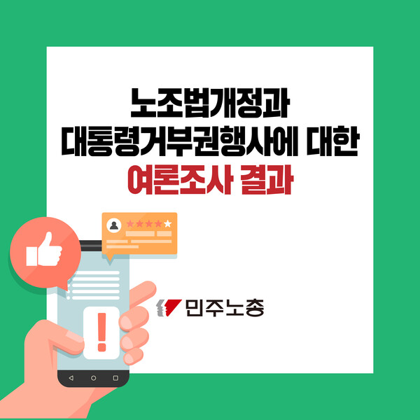 민주노총이 서던포스트에 의뢰해 11월 16일 우리 국민 1,013명을 대상으로 전화면접(CATI) 방식으로 조사한 질문 중 하나다. 원청과 하청 관계에서의 부당한 대우 유무, 원청 사용자의 책임을 강화하는 내용의 노동조합법 2조 개정, 노란봉투법으로 불리는 노동조합법 개정, 대통령의 거부권 행사 등에 대한 질문들이 이어지고 있다.