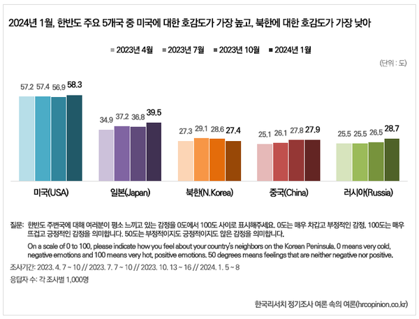 한국리서치가 2일 발표한 2024년 1월 주요 5개국 호감도 조사 결과에 따르면 북한 호감도가 27.4도로 5개국 가운데 가장 낮았다.