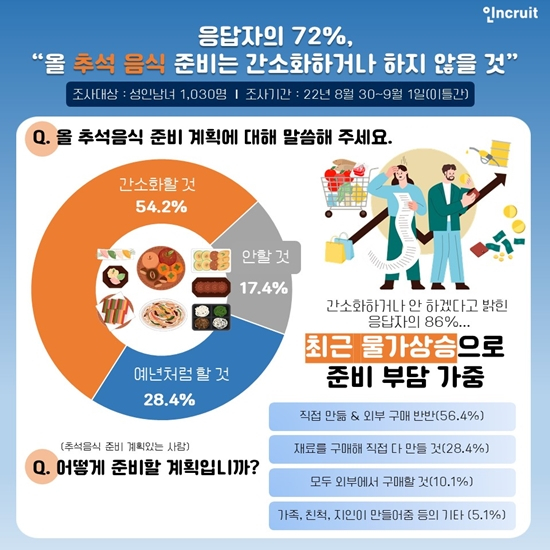 7일 인크루트가 지난달 30일부터 9월1일까지 자사 회원 1030명을 대상으로 올해 추석명절 준비에 대한 설문조사를 진행한 결과, 고물가로 음식준비를 간소화하겠다는 응답이 54.2%로 집계됐다. 아예 안할 것이라는 답변도 17.4%로 높았다. 예년처럼 준비할 것이란 답변은 28.4%에 그쳤다.