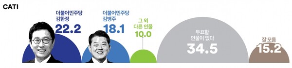 21일 이 조사에 따르면 민주당 차기 총선 후보로 누가 더 나은지 물어본 결과 이 지역에서 재선을 한 김한정 의원이 22%로 육군대장 출신의 김병주 의원(18%)과 오차범위 내에서 접전을 벌이는 모습이다. '투표할 인물이 없다'는 응답이 35%에 이르는만큼 절대적 지지를 받는 인물이 없어 누가 공천 경쟁에서 승리할 지 예상하기 어려운 상황이다.