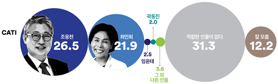 흥미로운 것은 조 후보나 최 후보 모두 여야 대결에서 승리하지만 민주당 후보 적합도에서 뒤진 최 후보가 조 후보보다 여야간 격차를 조금 더 벌리는 것으로 나타났다.