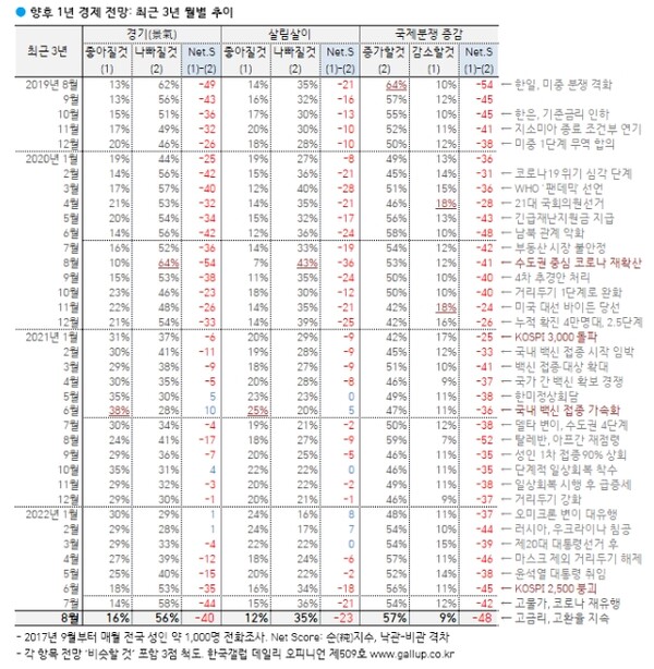 살람살이와 국제 관계 전망치도 석달째 답보 상태를 보이고 있다. 경기가 어려울 것이라는 전망과 더불어 향후 국민들의 살림살이가 팍팍해 질 것이라는 우려가 35%로 높았다. 좋아질 것이라는 낙관적 기대는 12%에 머물렀다. 응답자의 49%는 현재와 비슷할 것이라고 답했다.