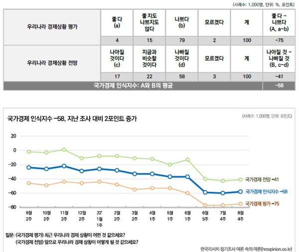 31일 한국리서치에 따르면 8월 마지막주 가정 경제 인식지수와 국가안보 인식지수 역시 마이너스 권에서 횡보세다. 긍정적 전망보다는 부정적 우려가 상대적으로 더 크다는 설명이다.