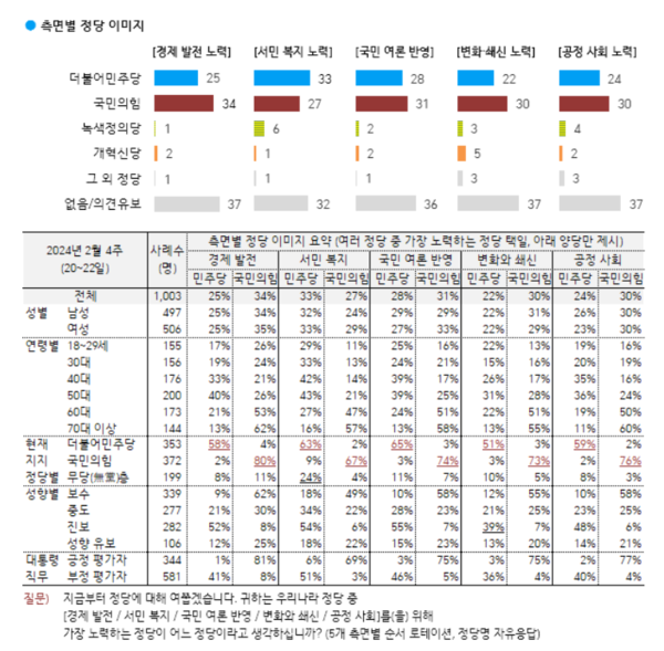 5개 측면별 이미지 중 민주당이 상대적으로 좋게 평가된 항목은 ‘서민 복지 노력’(민주당 33%, 국민의힘 27%) 하나 뿐이다. 나머지 항목, 특히 ‘경제 발전 노력’(민주당 25%, 국민의힘 34%), ‘변화 쇄신 노력’(민주당 22%, 국민의힘 30%) 등에서 국민의힘이 호의적인 평가를 얻고 있다. ‘공정 사회 노력’도 민주당(24%)보다 국민의힘(30%)에게 더 호의적이었다.