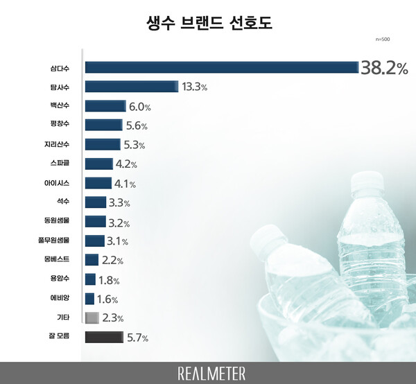 여론조사 전문기관 리얼미터가 지난 7월 성인남녀 500명을 대상으로 실시한 생수 브랜드 선호도 조사 결과, 우리 국민의 38%가 '삼다수'를 가장 좋아한다고 응답했다.