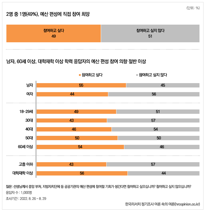 여론조사기관 한국리서치가 1일 발표한 <여론속의 여론>에 따르면, 공공기관의 예산 편성에 참여할 기회가 생긴다면 참여하겠느냐는 질문에 "참여하고 싶다"는 응답이 49%, "참여하고 싶지 않다" 51%로 각각 반반을 차지했다.