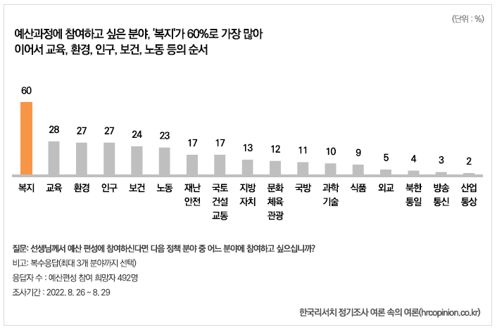 한편, 예산 편성 과정에 참여하고 싶은 응답자들의 경우 복지분야의 예산 편성에 참여하고 싶다는 의견이 많았다. "어떤 분야의 예산 편성 과정에 참여하고 싶은지" 질문한 결과, 교육, 환경, 복지, 외교, 국방 등 17개 주요 분야 가운데 복지분야 예산편성에 참여하고 싶다는 응답이 60%로 가장 많았다. 교육, 환경, 인구(저출산·고령화) 등 다른 분야들과 비교했을 때 두 배 이상 높은 결과다.
