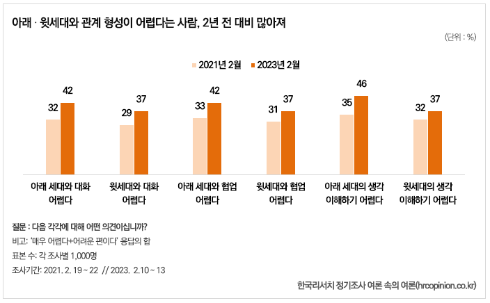 다른 세대의 생각을 이해하기 어렵다는 사람도 2년 전보다 늘었다. ‘아래 세대의 생각을 이해하기 어렵다’고 답한 사람은 46%로, 2년 전(35%)보다 11%포인트나 증가했고, ‘윗세대의 생각을 이해기 어렵다’는 응답(37%)도 2년 전(32%)보다 5%포인트 높아졌다.