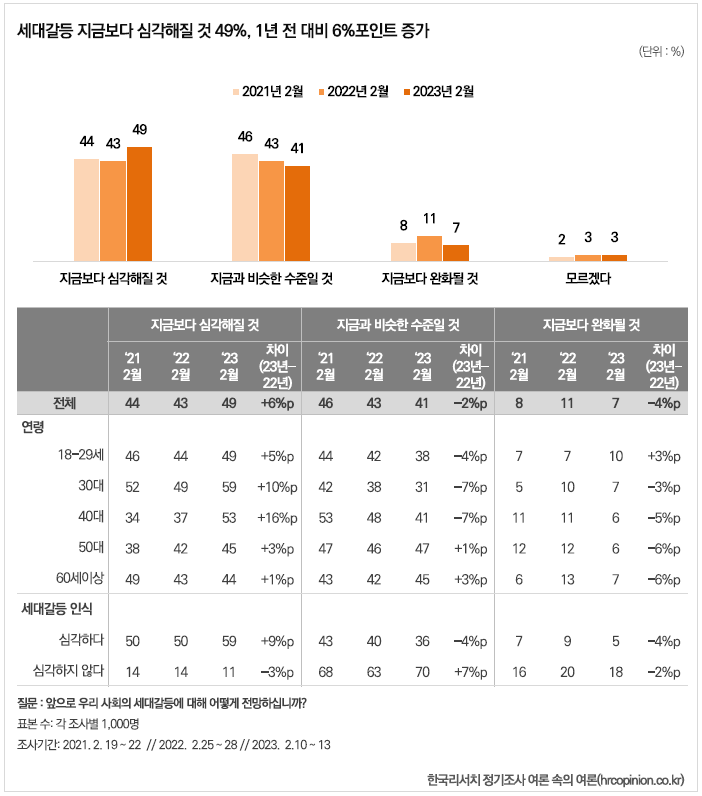 세대갈등이 지금보다 심각해질 것이라는 응답은 전 세대에 걸쳐 증가했는데, 특히 30대(49%→59%)와 40대(37%→53%)에서 큰 폭으로 증가했다.  20대 이하 세대와 50대 이상 세대 사이에 이른바 '낀세대'인 30대와 40대에서 세대갈등에 대한 심각성에 대한 전망이 더욱 어둡다.