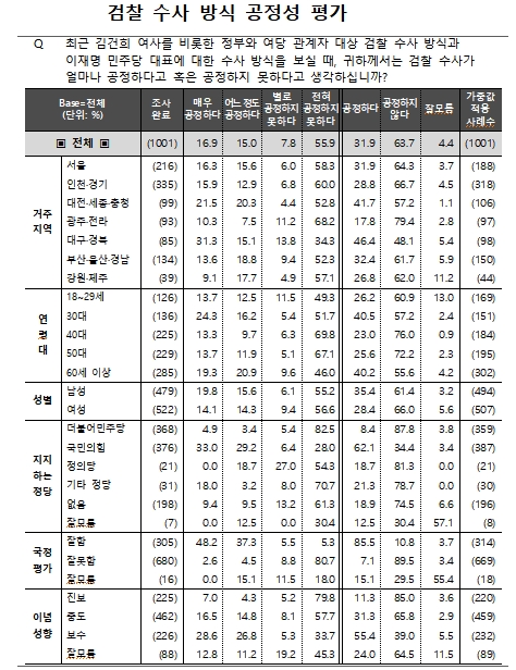 특히 '전혀 공정하지 못하다'는 의견이 55.9%로 '별로 공정하지 못하다'는 의견 7.8%보다 월등하게 앞섰다. 여당과 야당 지지기반인 대구·경북과 광주·전라 지역을 제외한 전 지역에서 평균치와 유사한 의견이 나왔다. 광주·전라지역의 경우 공정하지 않다는 의견은 79.4%로 까지 치솟았다. 대구·경북에서도 공정하지 않다는 의견이 48.1%로 공정하다는 의견 46.4%를 소폭 앞섰다.