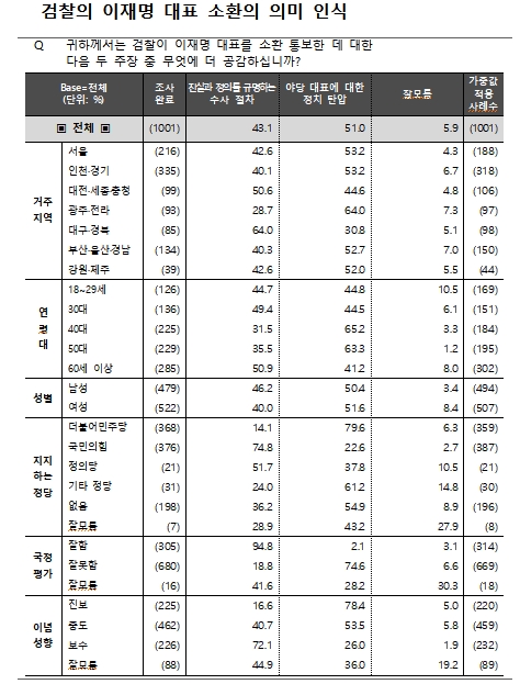 특히, 최근 검찰이 이재명 민주당 대표를 소환 통보한 데 대해 국민 절반(51%)이 야당 대표에 대한 정치 탄압으로 인식했다.