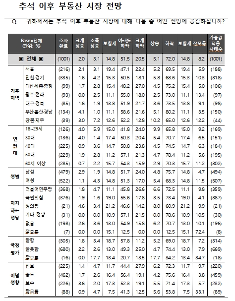 40∼50대 연령층에서 추석이후 부동산의 하락 전망치가 타 연령대에 비해 상대적으로 높았다.