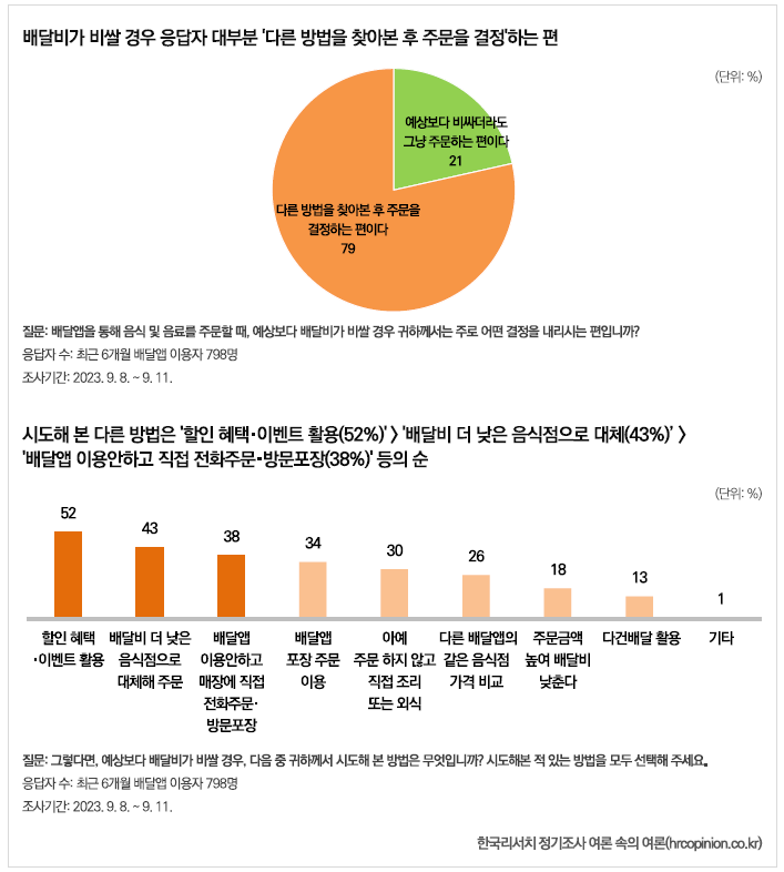 다른 방법으로는 ‘할인 혜택·이벤트 활용’ 응답이 52%로 가장 높았고, 이어서 ‘배달비가 더 낮은 음식점으로 대체 주문’ 43%, ‘배달앱을 이용 안하고 직접 전화주문·방문포장’ 38% 등의 순이다.