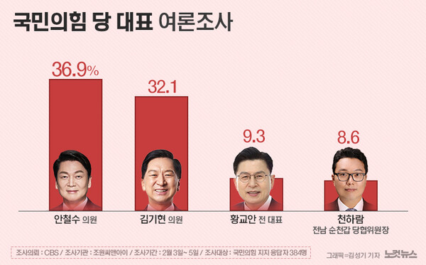 국민의힘 지지층 대상으로 당 대표 적합도를 분석한 결과 안철수 36.9%, 김기현 32.1%, 황교안 9.3%, 천하람 8.6%, 강신업 2.9%, 조경태 1.9%, 김준표 1.5%, 윤기만, 1.1%, 윤상현 0.7% 등의 결과가 나왔다.