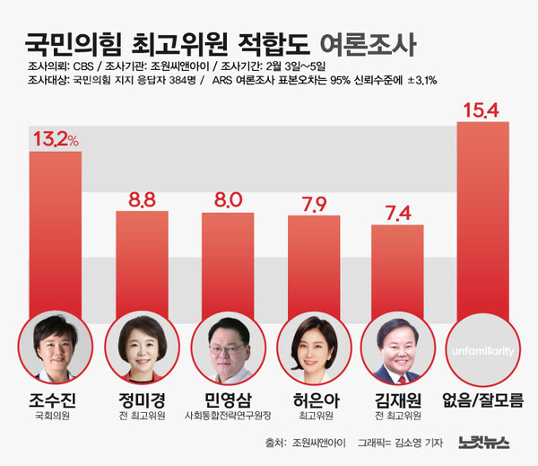 국민의힘 차기 지도부 선출을 위한 '3·8 전당대회' 후보 등록이 지난 3일 마감된 이후 처음 발표된 '당 대표 등 적합도' 여론조사 결과가 눈길을 끌었다.