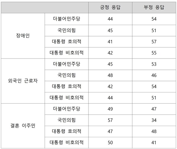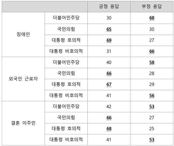 가령, 장애인 포용에 대해 국민의힘 지지자(65%)와 대통령 국정수행 호의적 평가자(69%)는 긍정적으로 답한 반면, 민주당 지지자(68%)와 국정수행 비호의적 평가자(66%)는 부정적 답변이 더 높았다.