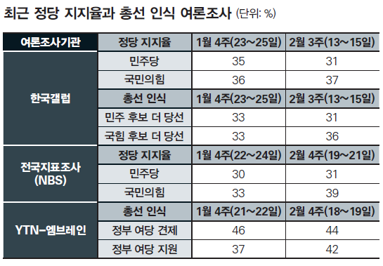 한국갤럽 조사에선 민주당보다 국민의힘 다수 당선에 공감하는 비율이 오차범위 이내에서 높은 편이었고, JTBC 여론조사에선 정부·여당이나 민주당 견제보다 양당 모두를 견제해야 한다는 의견이 훨씬 많았다. 전국지표조사(NBS)의 경우엔 정부 지원론과 견제론이 비슷했고, YTN 조사에선 여당과 야당 지원론 격차가 한 자릿수에 불과했다. 총선에서 민주당 필승카드로 생각했던 정권 심판론 동력이 약해졌다는 얘기다.