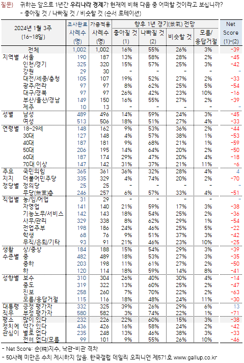 1월의 경제전망 순지수는 –39인데 대통령 직무수행 순지수는 –26으로 차이가 크지 않다.