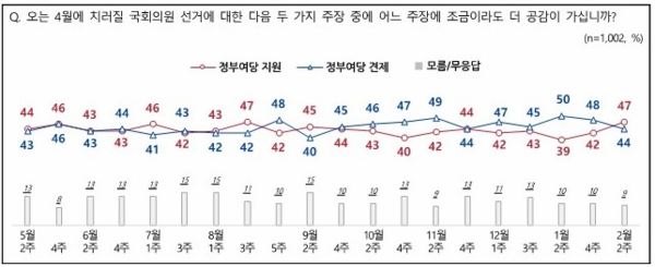 4월 총선에 대한 인식을 묻는 '정부여당 지원론'(국정운영을 위해 정부·여당에 힘을 실어야)과 '정부여당 견제로'(정부·여당 견제를 위해 야당에 힘을 실어야)도 1월에는 각각 39%, 50%로 여당견제론이 크게 우세했으나 2월에는 47% 대 44%로 여당지원론이 더 많아졌다. 민주당으로선 1월 11%p의 넉넉한 격차가 이달 들어 오히려 3%p 뒤지게 됐으니 마음이 쓰릴 것 같다.