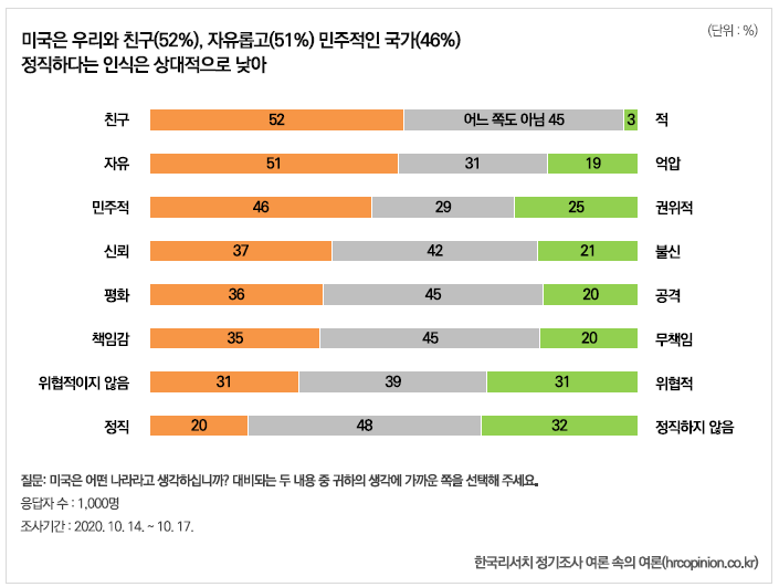 먼저 미국에 대한 이미지를 ‘친구 vs. 적’, ‘자유 vs. 억압’, ‘민주적 vs. 권위적’, ‘신뢰 vs. 불신’, ‘평화 vs. 공격’, ‘책임감 vs. 무책임’, ‘위협적 vs. 위협적이지 않음’, ‘정직 vs. 정직하지 않음’ 8개 문항을 제시한 후에 어느 쪽에 가까운지 물어보았다.