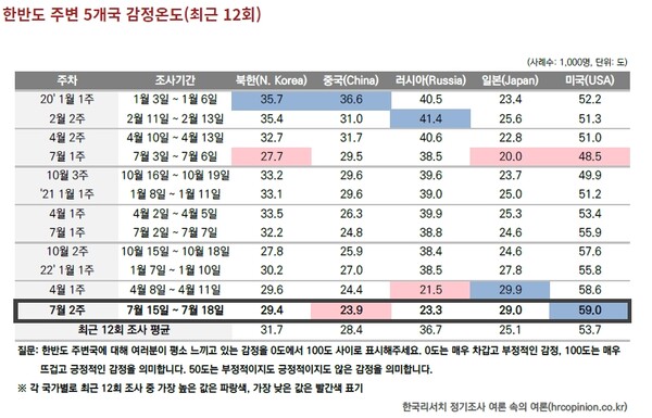 이번 조사는 한반도 주변 5개국 각각에 대해 평소 느끼고 있는 감정을 0도에서 100도 사이 점수를 매기는 방식으로 진행됐다. 0에 가까울수록 차갑고 부정적인 감정을, 반대로 100에 근접할수록 뜨겁고 긍정적인 감정을 뜻한다.