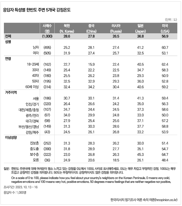 호감도를 거주지역별로 보면 미국, 일본은 서울거주자가 각각 59.4도, 41.3도의 호감을 보여 가장 높았고 북한은 광주·전라가 34.0도로 최고였다.