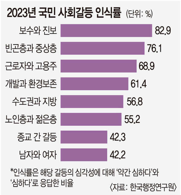 보수 대 진보에 이어 빈곤층과 중상층(76.1%), 근로자와 고용주(68.9%), 개발과 환경보존(61.4%) 순이었다. 수도권과 지방 갈등은 56.8%로 2년 연속 50%대에 머물렀다.