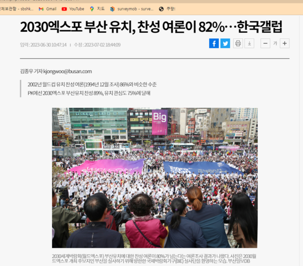 엑스포 부산 유치에 대한 찬반 여부를 묻는 질문도 포함하고 있더군요. 어떤 의도를 가지고 있는지 또 응답 결과에 어떤 의미를 부여할지 궁금합니다. 찬성 응답이 당연히 높기는 할텐데, 찬성 응답 비율이 아주 높게 나타나거나 아니면 기대했던 것보다 보다 낮게 나타날 경우 이를 어떻게 해석해야 할까요.