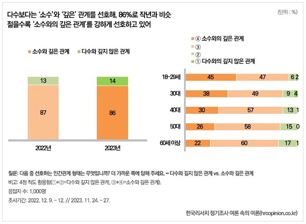 이번 조사에서 다수와 깊지 않은 관계(1점), 소수와 깊은 관계(4점) 중 어느 쪽을 더 선호하는지 4점 척도로 물은 결과 86%가 소수와의 깊은 관계를 더 선호한다고 답해 지난 해(87%)와 비슷했으며 '다수와 깊지 않은 관계'를 선호하는 사람은 14%에 그쳤다.