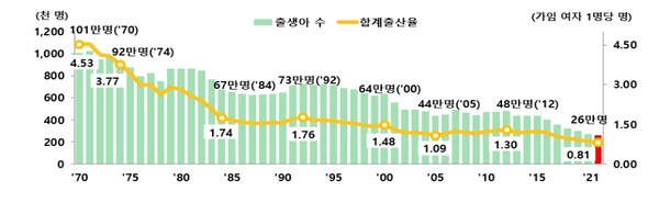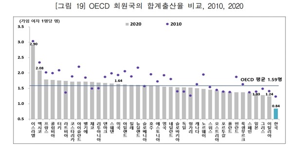 한편, 우리나라의 지난해 합계출산율은 0.81명까지 떨어지며 OECD 국가 중 꼴찌를 기록했다. 지난해 출생아수도 26만600명으로 전년대비 1만1800명(4.4%) 감소해 또다시 역대 최저치를 경신했다.
