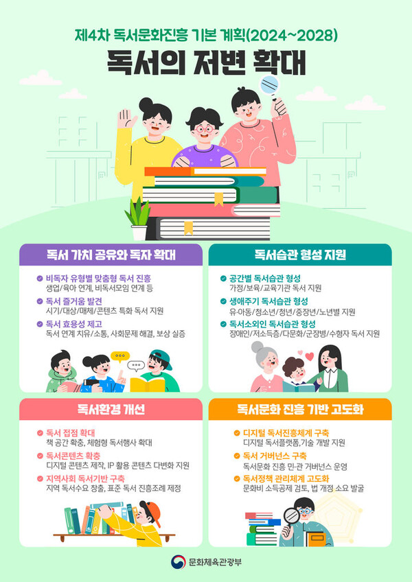 학생들의 독서지표는 개선되는 모습을 보였다. 초·중·고생의 종합독서율은 95.8%로 2021년 대비 4.4%p 상승했다. 연간 종합독서량은 36.0권으로 1.6권 늘었다. 독서에 쓰는 시간은 평일 하루 평균 82.6분, 휴일에는 89.0분으로 집계됐다. 학생 85.4%가 도서관 이용 경험이 있다고 했으며, 52.3%는 독서모임 등의 활동을 경험했다고 했다.