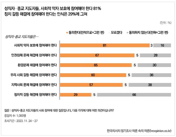 이에 따르면 성직자·종교지도자들의 사회참여를 물은 결과 사회적 약자 보호에 참여해야 한다에 81%가 동의해 가장 많았다. 또 인권, 환경, 사회갈등, 지역사회 문제 해결에 나서야 한다는데 각각 67%, 65%, 60%, 57%가 동의해 과반이 넘었다.