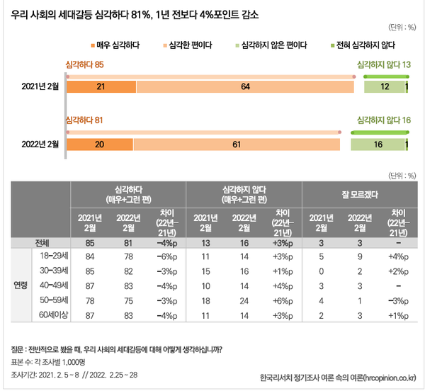 한국리서치가 지난 2월 말에 실시한 조사결과에 따르면, “세대갈등이 심각하다”고 답한 응답자는 전체의 81%(매우 심각하다 20%, 심각한 편이다 61%)로 여전히 대다수가 우리 사회의 세대갈등이 심각하다고 인식하고 있지만, 1년 전에 조사에 비하면 심각하다는 응답은 4%포인트 줄어들었다. 세대갈등이 심각하다는 응답이 전 연령대에서 3~6%포인트 감소하는 모습을 보였다는 점에서 의미가 크다.