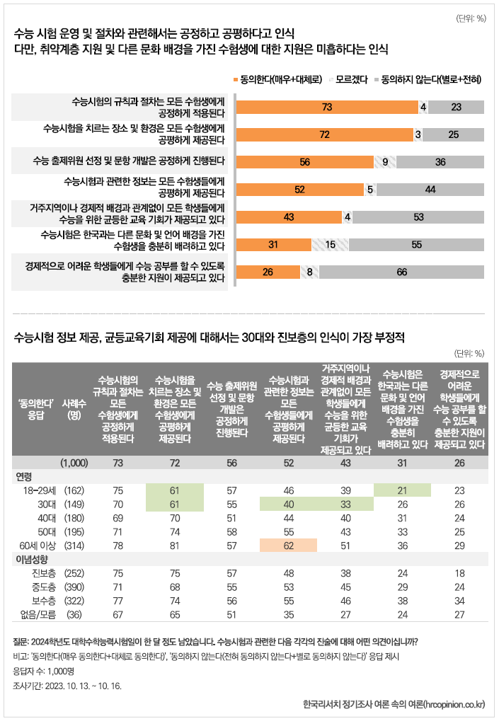 조사에 따르면 수능시험의 규칙과 절차, 수능시험을 치르는 장소 및 환경은 모든 수험생에게 공정하게 적용된다는 설문에 72~3%가 동의해 10명 중 7명이상이 동의했다. 동의하지 않는다는 응답은 각각 23%, 25%였다.