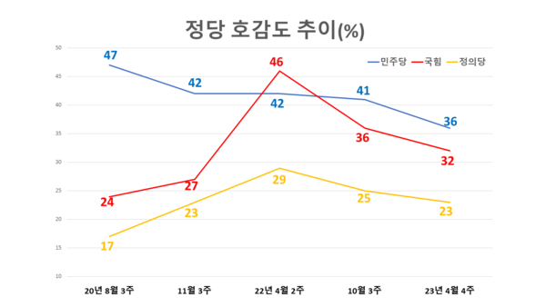 국민의힘에 대한 호감도는 지난 해 대통령선거 직후인 4월 둘째 주만 해도 46%에 이르렀는데, 지금은 32%로 1년만에 14% 포인트나 떨어졌다. 더불어민주당도 1년 사이에 42%에서 36%로, 정의당 역시 29%에서 23%로 둘 다 6% 포인트 하락했다.