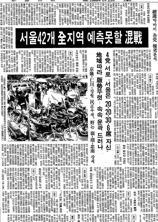선거를 사흘 앞두고 조선일보는 각 당에서 주장하는 내용을 근거로 선거 판세를 보도했다. 수도권 지역에서 민정당은 20, 민주당도 20, 평민당 30, 신민주공화당이 6곳을 우세 지역이라고 주장했다. 수도권 지역구가 42곳인데 각 당이 주장하는 우세 지역은 76곳이나 되었다.