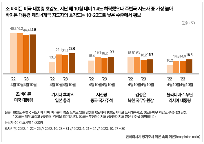 조사에 따르면 5개국 지도자의 호감도는 중간인 50도를 모두 밑돌았지만 조 바이든 미국 대통령이 44.8도로 가장 높았다. 기시다 일본 총리가 23.6도로 뒤를 이었으며 시진핑 중국 주석은 김정은 북한 국무위원장보다 3도 높은 19.7도로 3위였다. 김정은 위원장은 꼴찌인 블라디미르 푸틴 러시아 대통령보다 불과 0.2도 높은 16.7도로 4위였다.