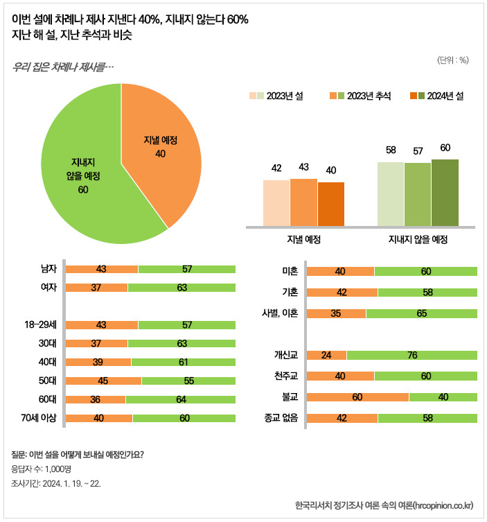 설 명절에 차례나 제사를 지낼 예정이라는 응답은 40%에 불과했고 지내지 않는다가 60%로 더 많았다.