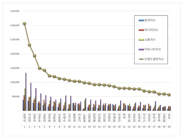 1위 유재석 브랜드는 참여지수 391,688, 미디어지수 549,259, 소통지수 787,749, 커뮤니티지수 1,335,815를 합해 브랜드평판지수 3,064,511을 기록했다. 지난 7월 브랜드평판지수 2,569,823과 비교하면 19% 상승했다.