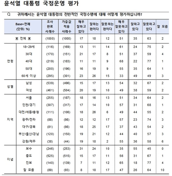 부정적 평가는 '잘못하는 편이다'(12%), '매우 잘못하고 있다'(51%) 등으로 집계, 적극적인 반대층 비율이 상대적으로 높게 나타났다.