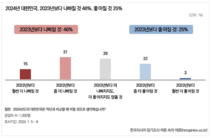 이 조사에 따르면 2024년의 대한민국은 작년과 비교할 때 ‘나빠질 것’이라는 사람이 46%로 가장 많았다. 4명 중 1명(25%)은 ‘좋아질 것’이라고 했으며 29%는 ‘나빠지지도 좋아지지도 않을 것’이라고 했다.