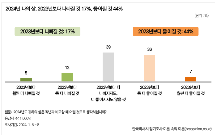 2024년의 내 삶이 작년과 비교할 때 어떨 것이냐는 설문에 ‘좋아질 것’이라는 응답이 44%로 ‘나빠질 것'(17%)에 비해 2.6배 많았다. 39%는 ‘나빠지지도 좋아지지도 않을 것’이라고 했다.