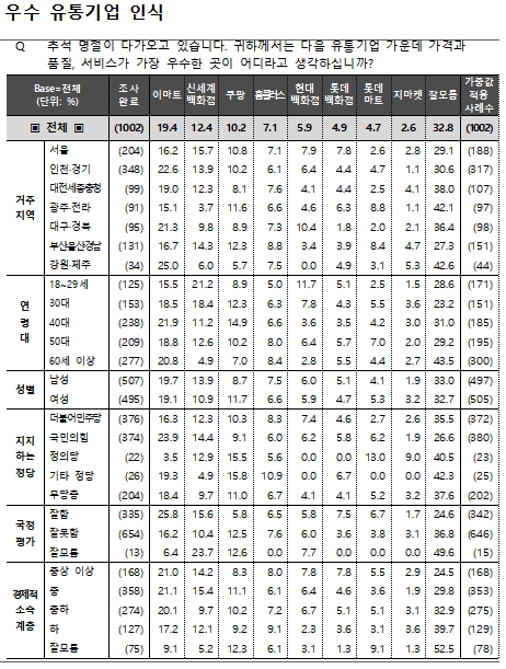 1일 스트레이트뉴스는 여론조사기관 조원씨앤아이에 의뢰해 지난달 28~30일 전국의 만 18세 이상 성인남녀 1002명을 대상으로 추석명절 유통기업 가운데 가격과 품질, 서비스가 가장 우수한 곳이 어디라고 생각하냐는 내용의 설문조사 결과 이같이 조사됐다고 밝혔다.
