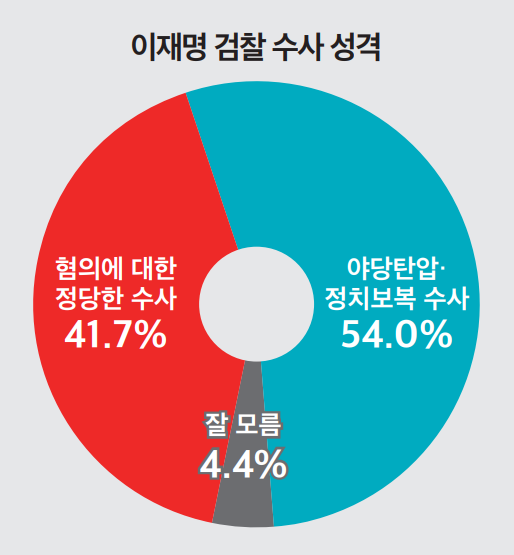 뉴스토마토, ‘야당탄압·정치보복 수사’54%…’혐의에 대한 정당한 수사’42% 문화일보, ‘불법 의혹에 대한 정당한 수사’51%…‘야당 탄압·표적 수사’41% NBS, ‘부패범죄에 대한 정당한 수사’48%…’야당탄압 위한 정치적 수사’41%