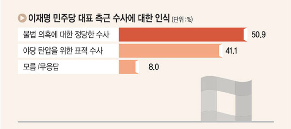 하지만, 사흘 뒤에 엠브레인이 조사한 <문화일보>의 창간 31주년 특집 여론조사 보도에 따르면, 이재명 대표의 측근 수사에 대해  ‘야당 탄압·표적 수사’(41%)라기 보다는 ‘불법 의혹에 대한 정당한 수사’(51%)라는 여론이 우세한 상반된 조사 결과가 나왔다.
