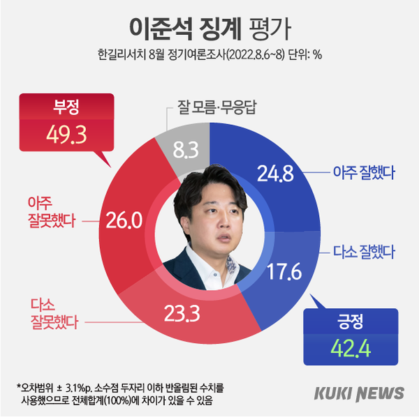 지난 7월 초, 국민의힘 윤리위가 이준석 당대표를 징계한 직후에 실시한 쿠키뉴스 여론조사에서는 이 대표 징계가 ‘잘됐다’는 평가가 48%로  ‘잘못됐다’는 평가 43% 보다 오차범위내이지만 5% 포인트 높게 나타났었다.