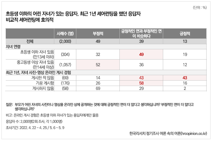 하지만, 초등생 이하 자녀가 있는 응답자의 경우에는 부정적 응답이 32%, 긍정적인 면과 부정적인 면을 비슷하게 보는 응답이 49%로 '셰어런팅'에 대해 상대적으로 호의적이었다..