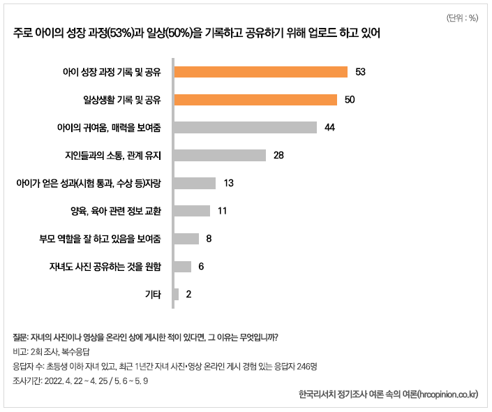 그 결과, ‘아이의 성장 과정(53%)과 일상(50%)을 기록하고 공유하기 위해서’ 라는 응답이 가장 많았다. 다음으로 ‘아이의 귀여움과 매력을 보여주기 위해(44%)’, ‘지인들과 소통하고 관계를 유지하기 위해(28%)’ 등이 뒤를 이었다.