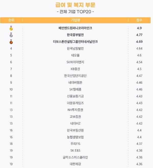 29일 기업 정보 플랫폼 잡플래닛이 상반기 자사 홈페이지에 남겨진 리뷰를 바탕으로 급여와 복지 만족도 수준 등으로 평가한 주목할 기업 20선에 따르면, 전체 1위는 외국계인 베인앤드컴퍼니가 차지했다. 5점 만점에 4.9점을 획득했다. 한국중부발전이 4.77점, 더보스톤컨설팅그룹이 4.69점으로 2위와 3위를 기록했다.