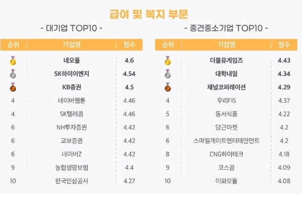 한전의 또다른 발전자회사 한국남동발전이 4.64점, 넥슨의 게임 개발 자회사 네오플이 4.6점, SK그룹의 반도체전기설비회사인 SK하이이엔지와 KB증권 등이 4∼7위를 기록했다.